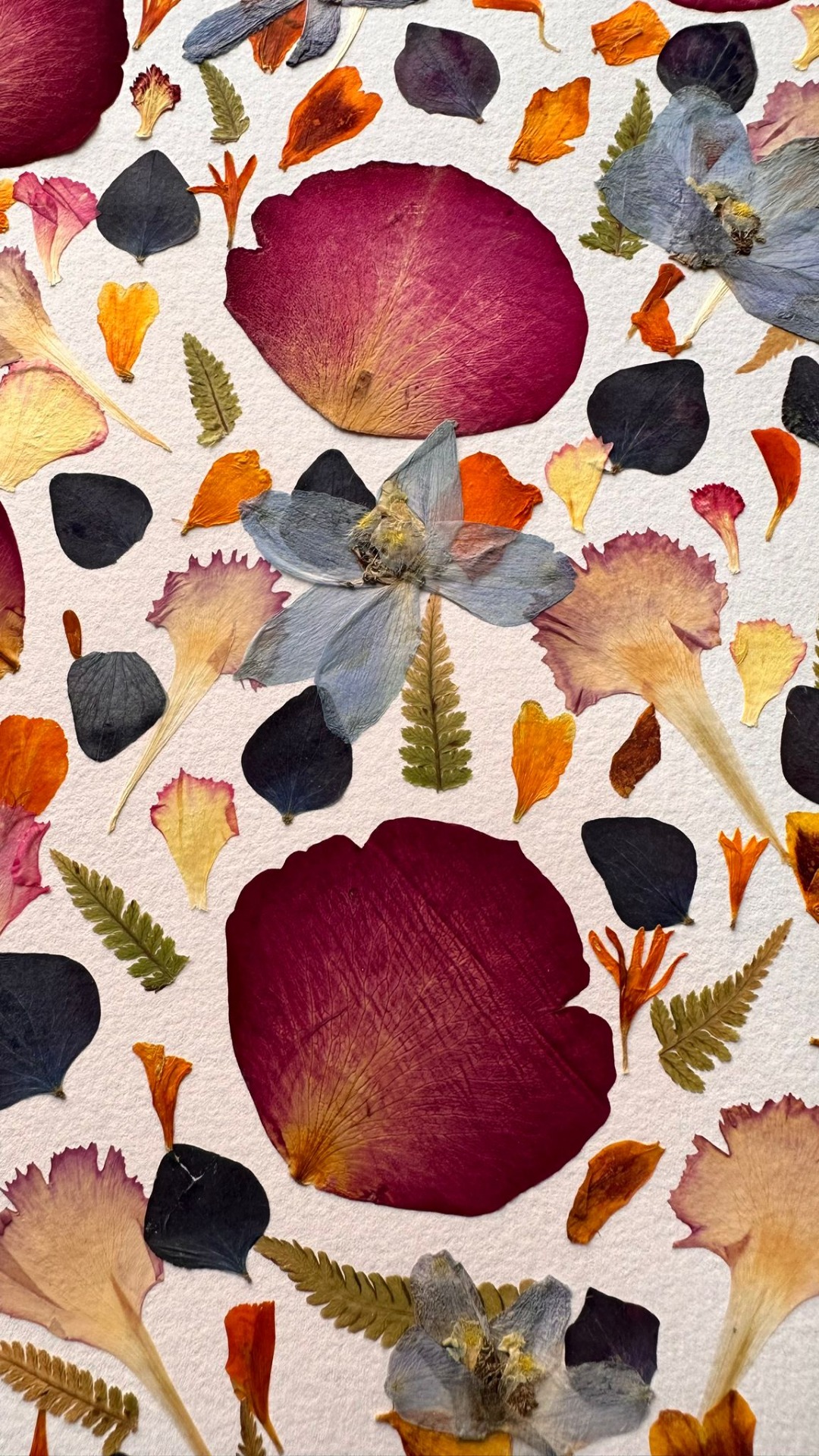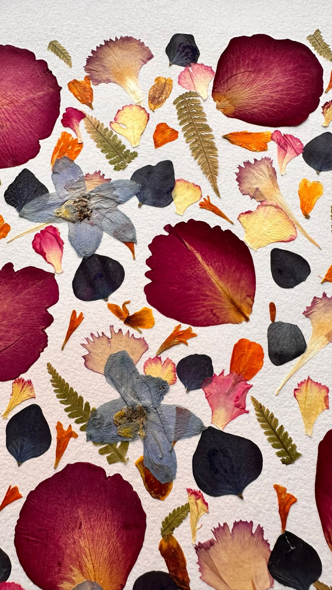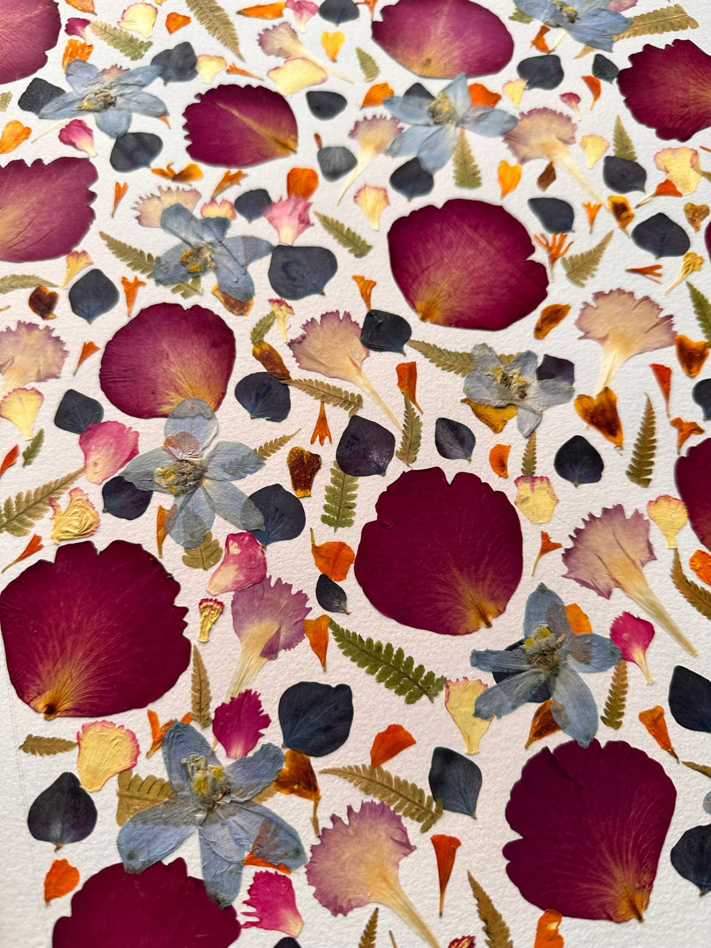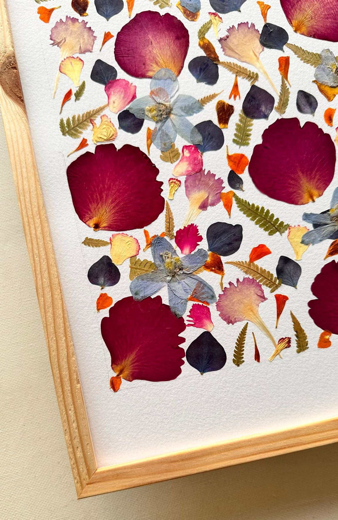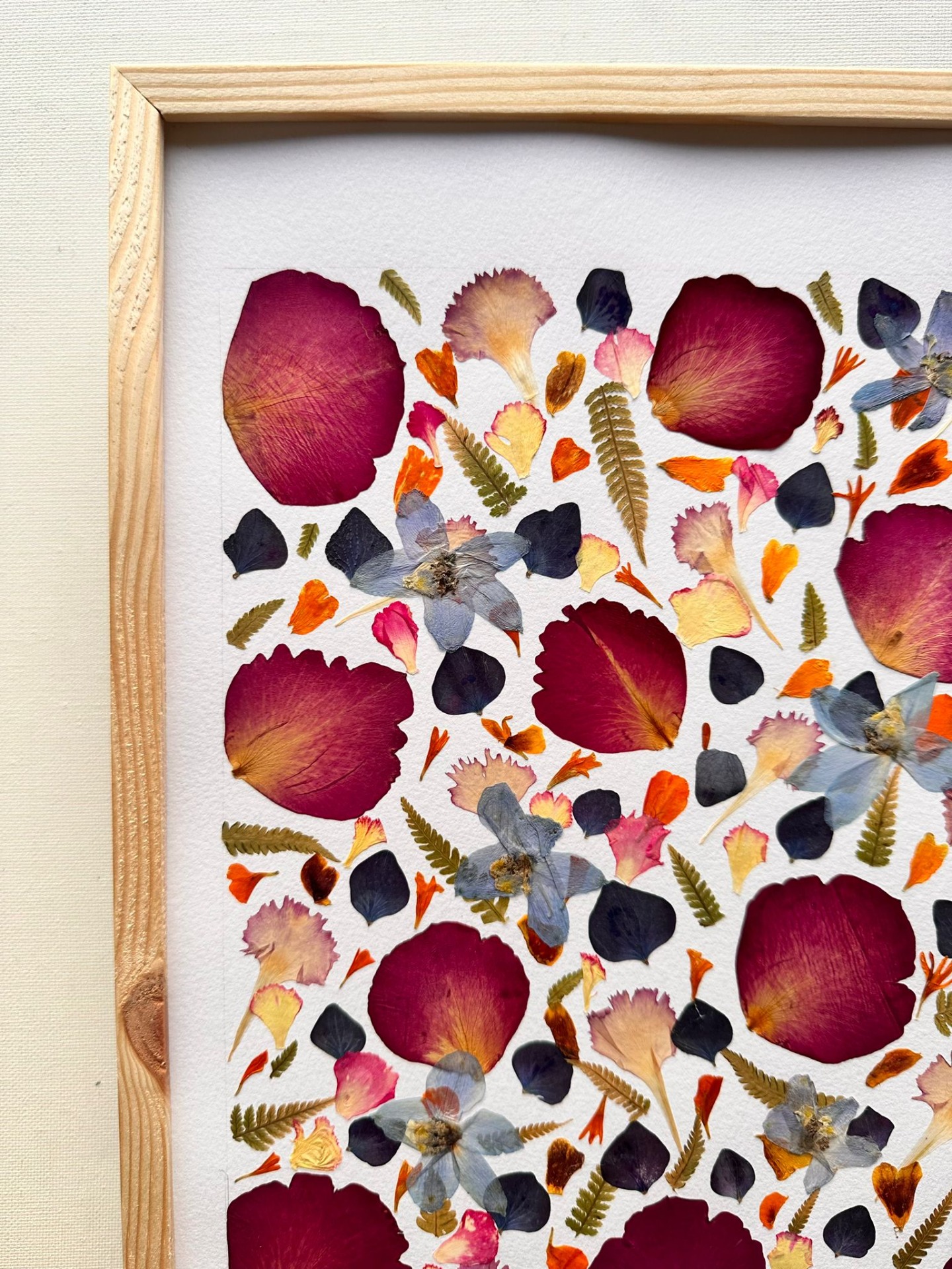 This joyful artwork bursts with color and energy through a striking arrangement of pressed petals and leaves. Bold red blossoms dominate the composition, beautifully contrasted with soft pinks, golden tones, and delicate blue flowers. The careful layering of shapes and hues creates a lively mosaic that radiates warmth and vitality. Set in a natural wooden frame, this piece is perfect for brightening any space with a fresh, botanical charm and an artistic touch of nature's palette.