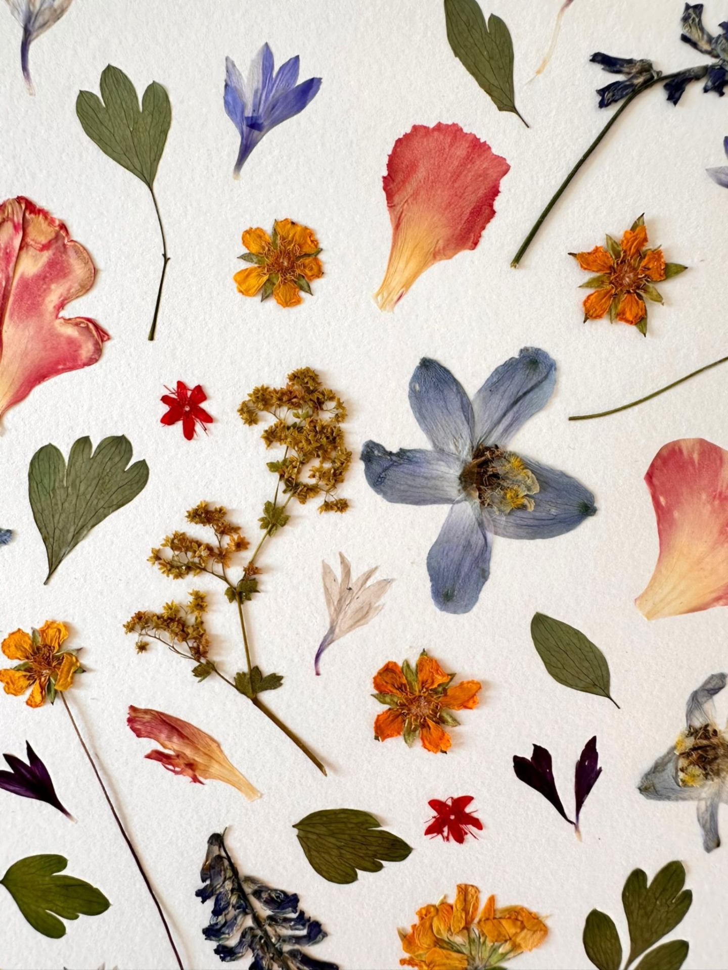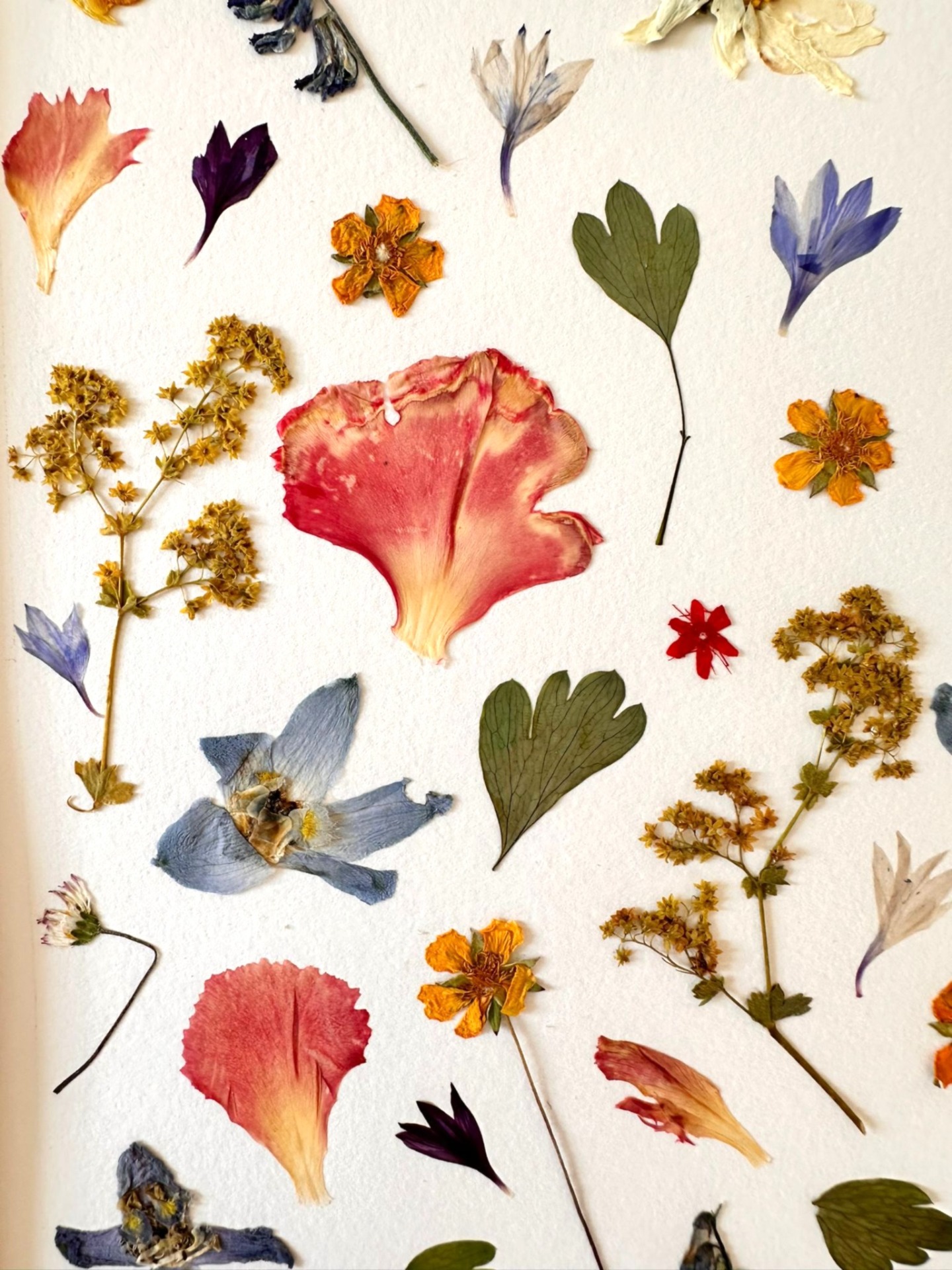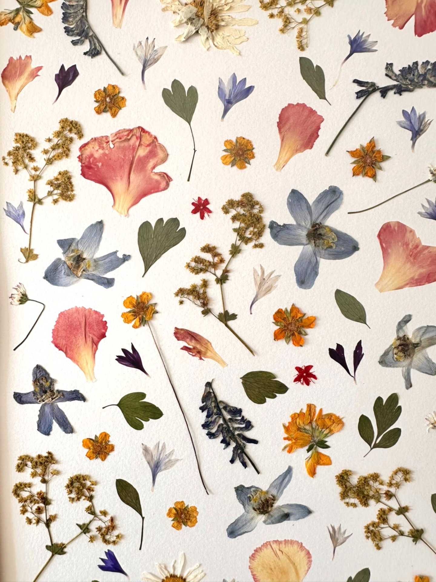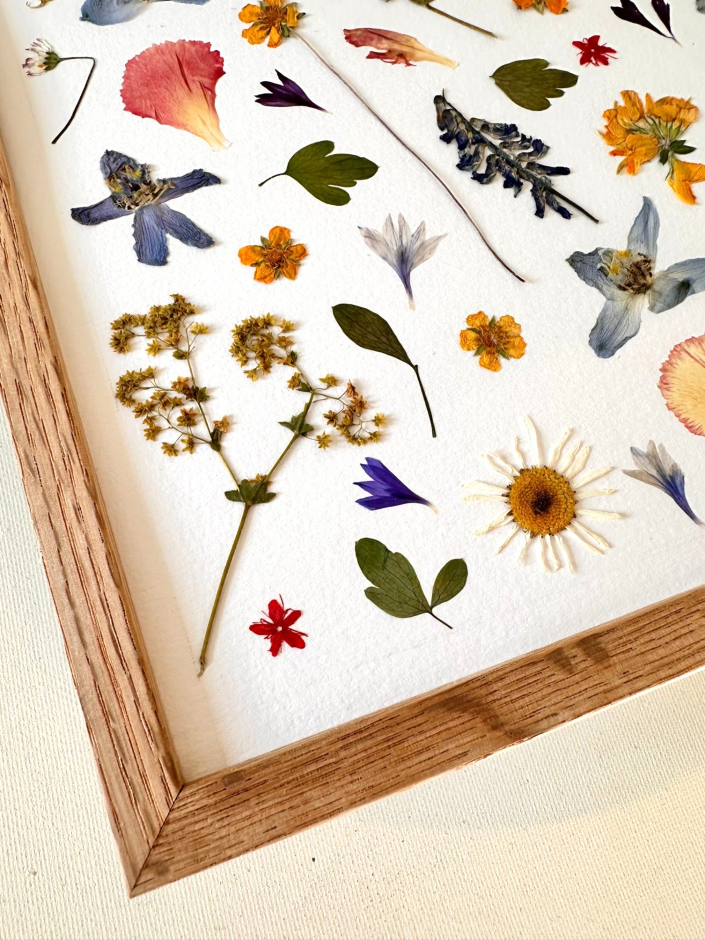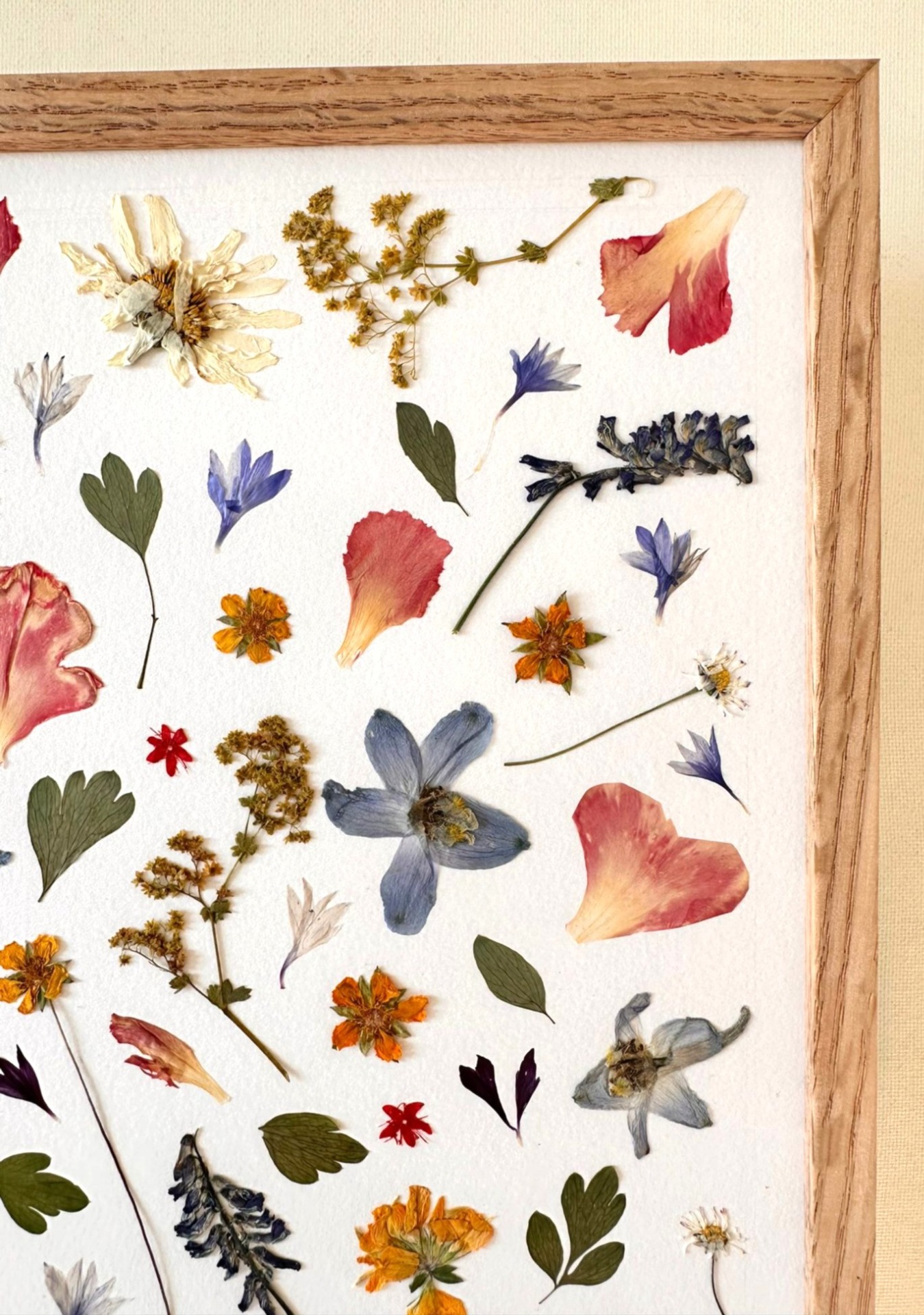 This charming piece features a harmonious collection of pressed wildflowers and leaves, beautifully arranged in a natural wooden frame. Soft petals in shades of pink, blue, yellow, and violet create a lively yet balanced composition that celebrates the diversity of nature. Each flower is carefully preserved to highlight its unique texture and color, making this artwork both timeless and one of a kind. Perfect for bringing freshness, elegance, and a touch of natural poetry into any living space.