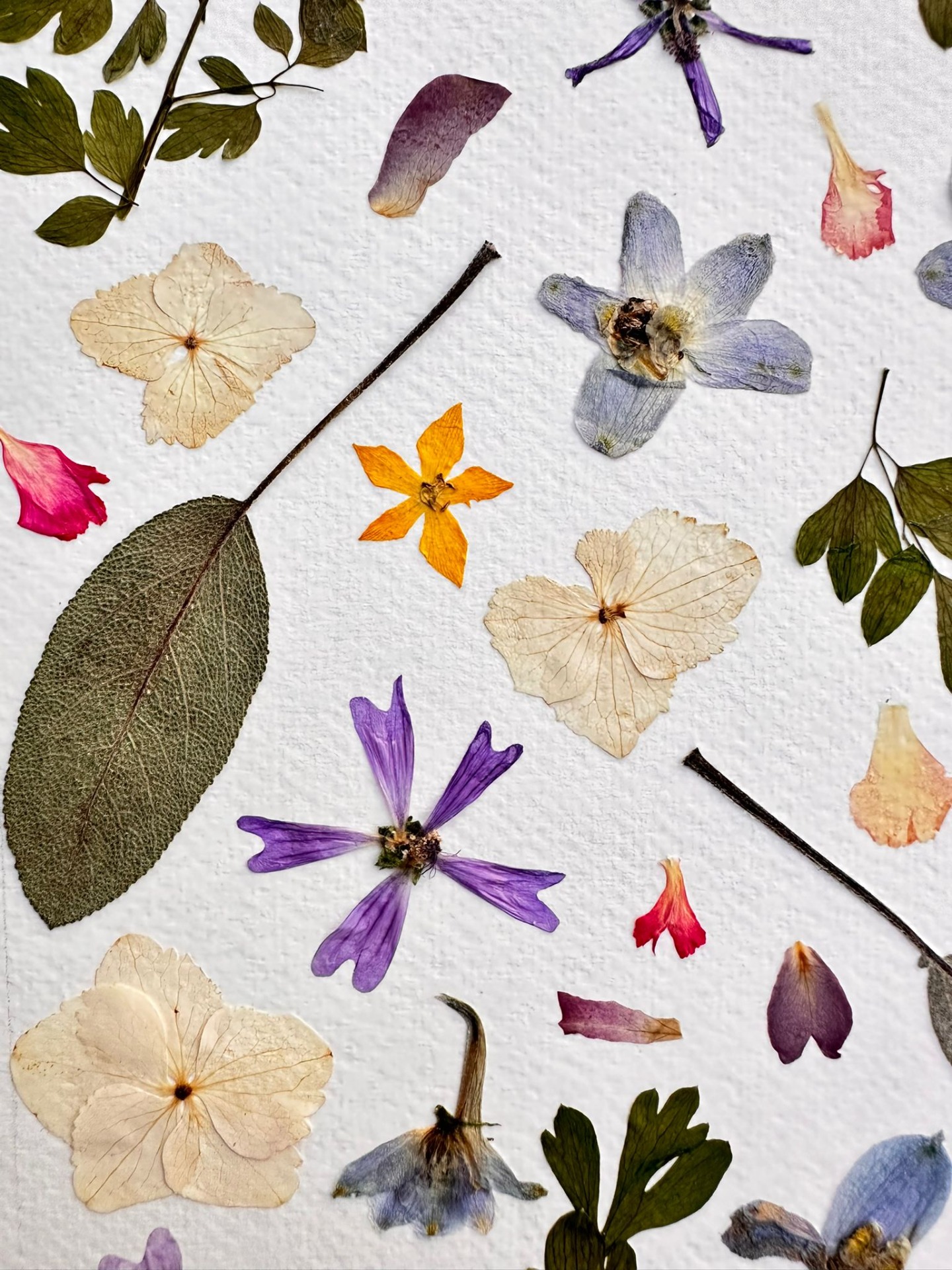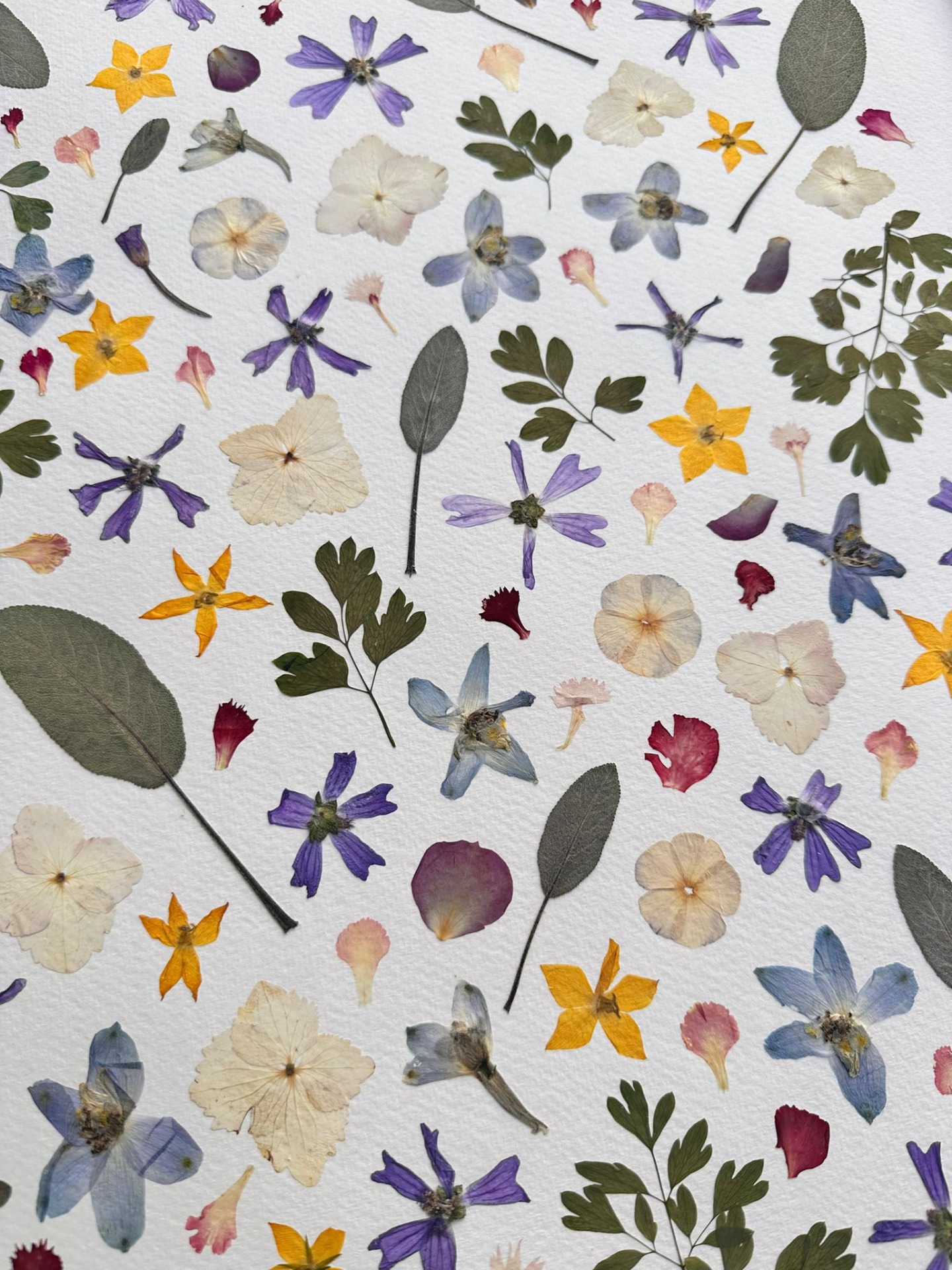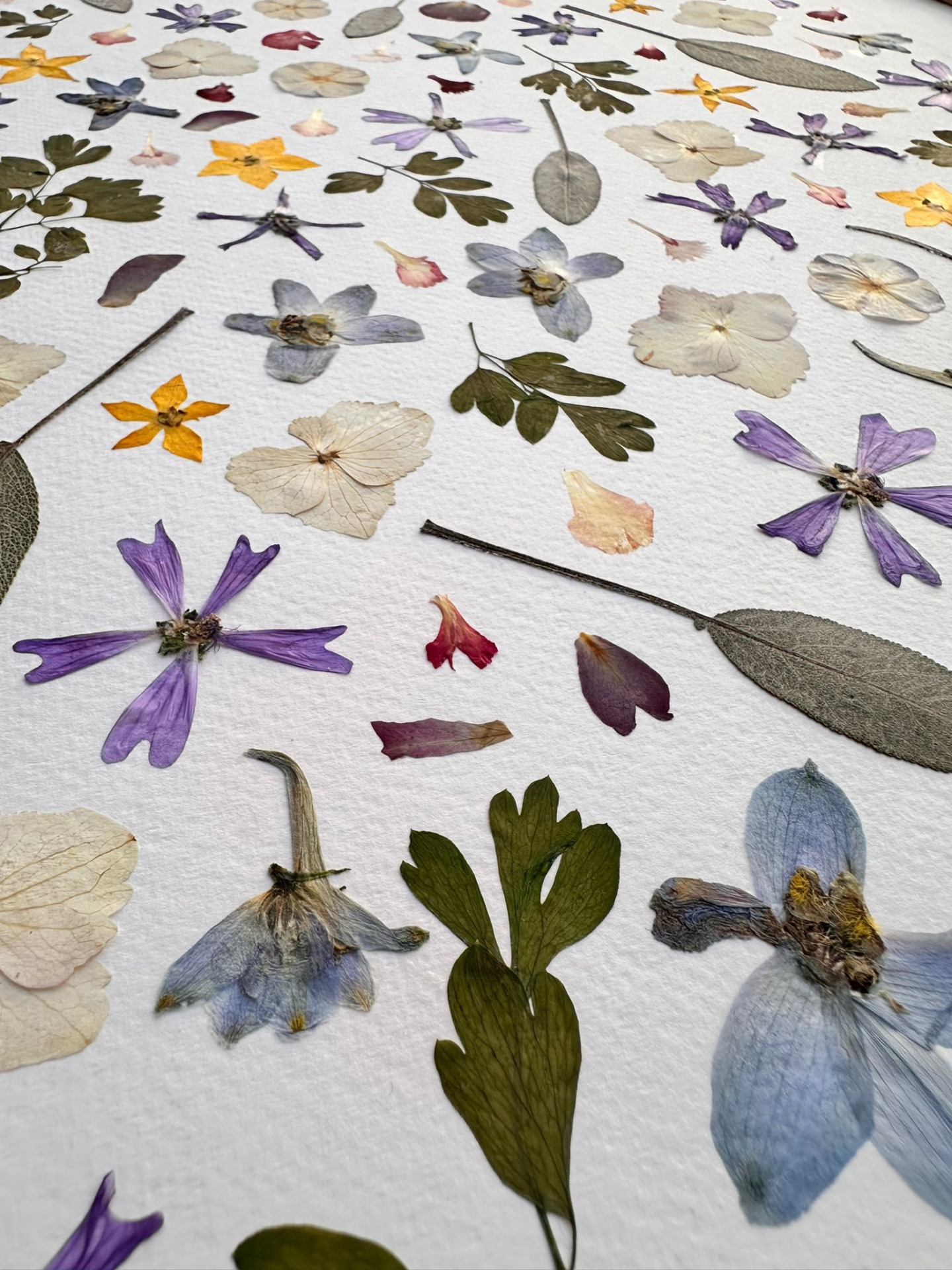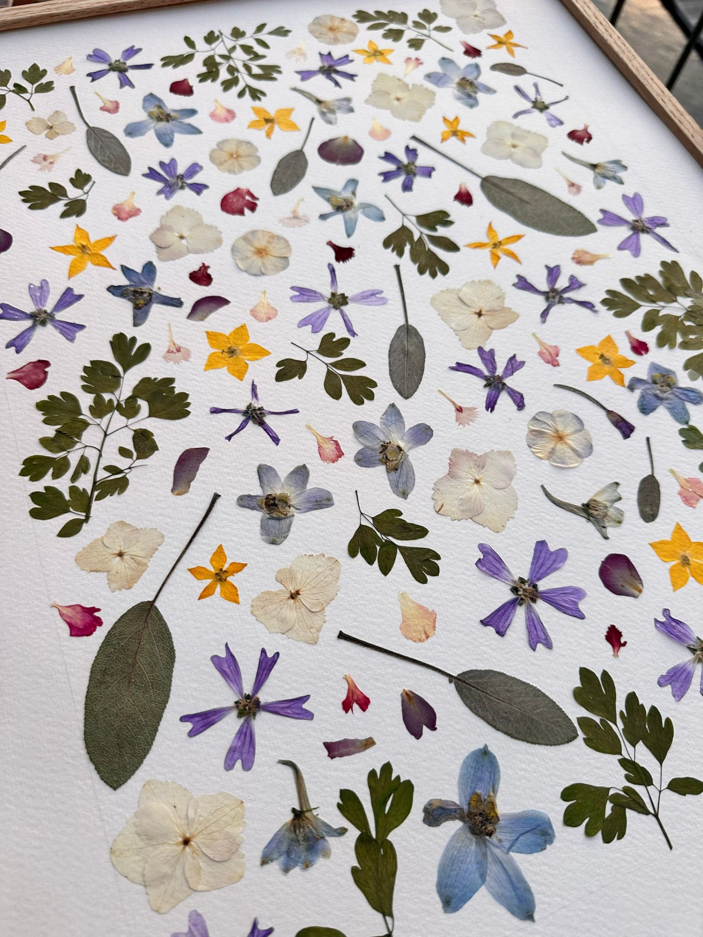 Pressed flower frame featuring white, lilac, blue, and yellow flowers, complemented with fern leaves and green foliage. A fresh and bright composition that reflects the beauty of wild nature.